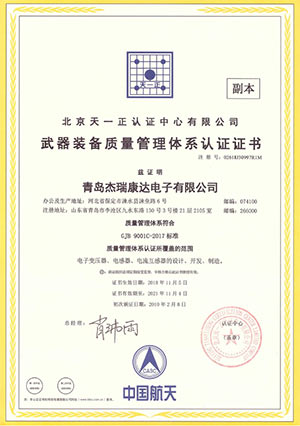 青島杰瑞康達電子有限公司通過復審,于近日再次取得北京天一正認證中心頒發的《國軍標質量管理體系認證證書》,注冊號:02618J30997R1M,質量管理體系符合 GJB9001C-2017 標準。證書有效期自 2018 年 11 月 5 日至 2021 年 11 月 4 日。