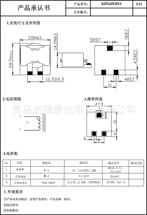5.電感量:2×(1±15%)uH6.工作溫度:-55℃~+130℃